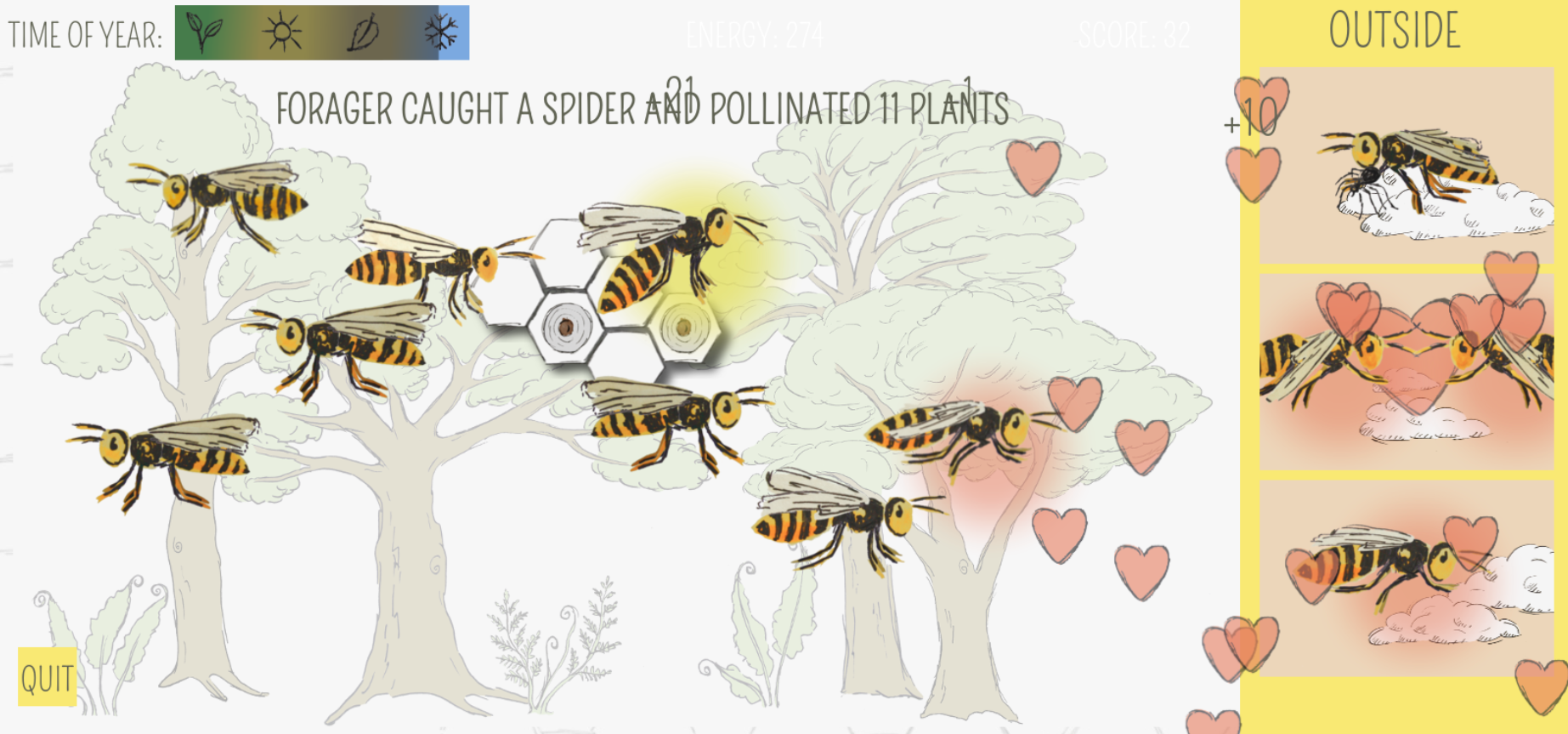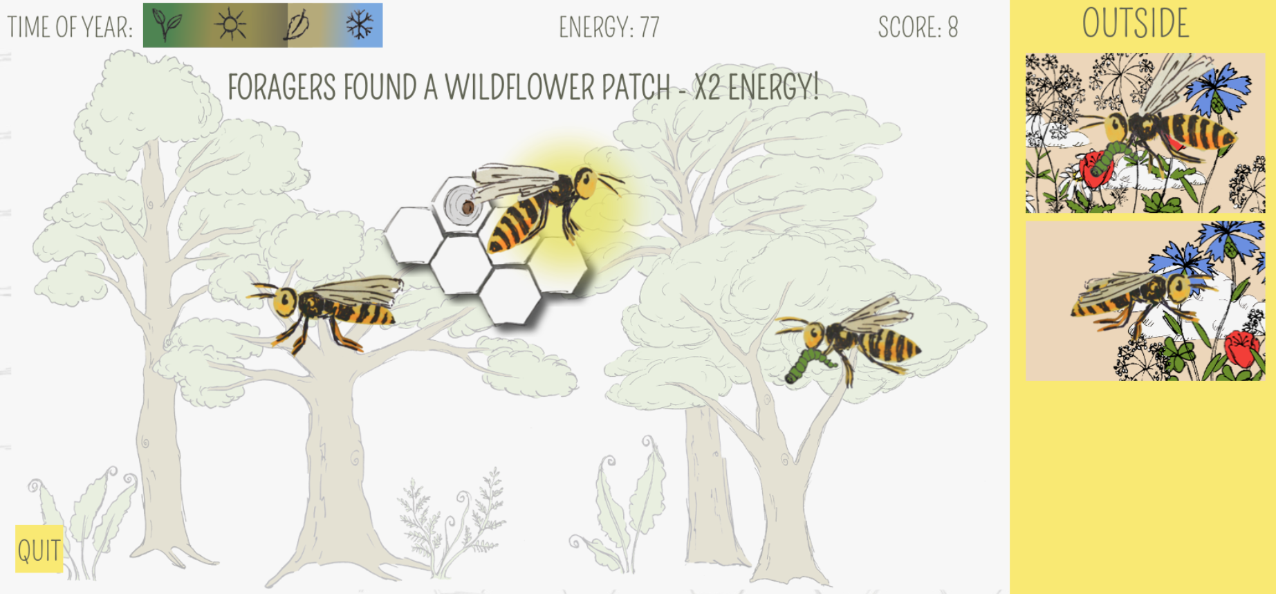 Fully hand illustrated 2D game commission for University College London, to help people understand and empathise with wasps - you can play it online. The hand drawn aesthetic makes the wasp characters feel approachable and gentle, without them becoming unnecessarily abstracted or cartoon-like. Illustrations in watercolour and ink. The game is also available on Itch (4.7/5 stars). It has been exhibited at the Eden Project, Glasgow Science Centre, and the Royal Entomological Society's Insect Week, and featured as 'App of the week' in The Week Junior.